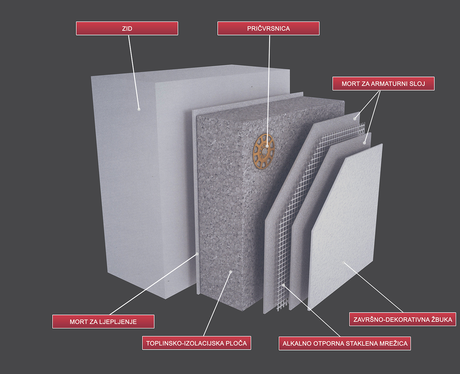 Toplinska izolacija vanjskih zidova (fasada) je najvažniji dio toplinske izolacije objekta jer najviše utječe na mikroklimatske uvjete boravka u unutarnjim prostorima. Kroz vanjske zidove i otvore se gubi veliki dio energije za grijanje zimi i hlađenje ljeti. Stoga je dobra toplinska izolacija preduvjet za ugodne i zdrave uvjete življenja. U zadnjih 40 godina stiropor se pokazao kao odličan materijal za primjenu u povezanim sustavima za vanjsku toplinsku izolaciju (ETICS sustav prema normi HRN EN 13499:2004). Dugogodišnja primjena, praktična provjera i razvoj ETICS sustava sa sigurnošću jamči njegovu trajnost i učinkovitost.